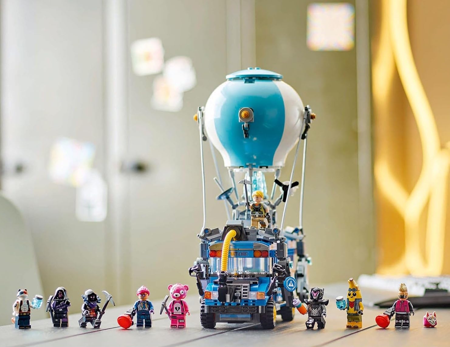 Get ready to bring Fortnite off the screen and into your room with the LEGO Fortnite Battle Bus (Set 77073). With 954 pieces, this impressive build captures one of the most iconic vehicles from the game: the hot‑air balloon‑powered Battle Bus that launches players into action. The set includes nine beloved minifigures—like Adventure Peely, Cuddle Team Leader, Meowscles, Raven, Drift, and more—plus in‑game inspired accessories such as Slurp Juice, Pickaxes, a Grappler, and Slap Juice.